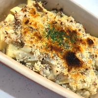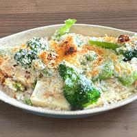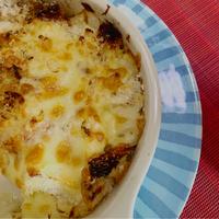 - 4 3に、合わせた(A)をのせ、パン粉、パルメザンチーズを散らし、オーブントースターで10分前後、焼き色がつくまで焼きます。
