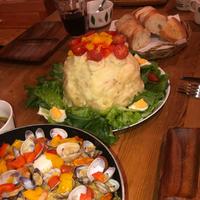 ソースをたっぷり使ってしまったので、表面にじゃがいもをコーティングするときにソースを巻き込んでしまい、じゃがいもにソースの色が混じって少しまだらになってしまいました…