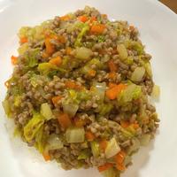 - 4 豚ひき肉に火が通り、白菜がしんなりしたら(A)を入れて中火で炒め合わせます。