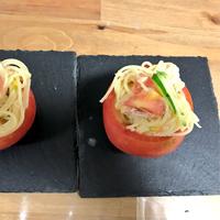 サラダスパゲティでできるおしゃれなトマトカップの冷製パスタです。サラダスパゲティは通常のパスタよりも短いのでトマトカップにぴったりで、簡単にアレンジできる「#ママワザ」です。野菜もパスタも一緒に楽しめて、見た目もおしゃれな一品です。ぜひお試しください。