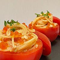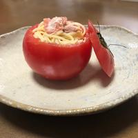 ・トマトの中身はトングで潰すようにして混ぜ、お好みの大きさになるように仕上げてください。 ・トマトカップが安定しない場合、トマトの底を少し切り落とすと安定します。 ・トマトから水分がでるので、パスタは食べる直前にあえて盛りつけてください。