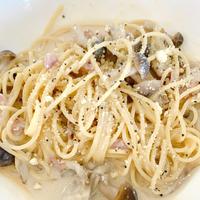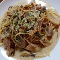 しいたけがあったので、最初はペペロンチーノ味にしようと思い調理スタート。ほぼほぼペペロンソース完成しかけたところで冷蔵庫に生クリーム30mlとスライスチーズを見つけたので入れてみました。牛乳なく生クリームも少量ですが充分にコクのある絶品に仕上がりました。