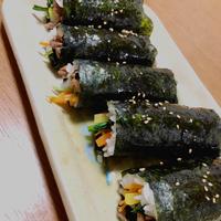 やみつきになる美味しさで箸が止まらない一品です。ご飯に胡麻油の香りが豊かに広がり、たくあんのシャキシャキした食感がアクセントになっています。ほうれん草やにんじんなどの野菜もたっぷり入って栄養バランスも◎。お肉は炒めて使うとより美味しく、具材は家にあるもので気軽にアレンジできます。巻き方のコツは具を控えめにすることで、子供からも好評のおかずになりますよ。