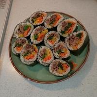 巻きにくかったので太巻きにしてしまいました。お肉がもう少し濃い味でも良かったかな?