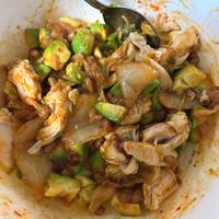 - 準備 アボカドは種を取り、皮をむいておきます。鶏ささみは筋を取り除いておきます。