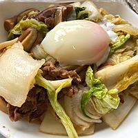 正田すき焼きのたれ➕さぬき冷凍うどんを湯がいたうどん➕舞茸➕玉ねぎ➕すり下ろし人参➕ごまたまご➕牛肉