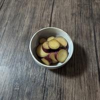 - 2 サツマイモを鍋に移し、水・黒糖・みりん・酒・塩を入れ火にかけ、汁気が無くなる程度に煮たら完成です!