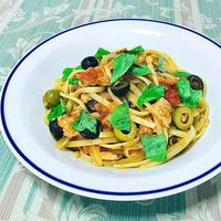「ツナとオリーブのトマトソースパスタ」の作り方を簡単で分かりやすいレシピ動画で紹介しています。