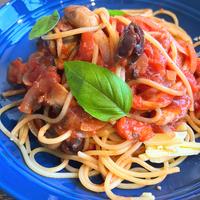 パスタ料理の王道、トマトソースのスパゲティです。 トマトソースは煮込むことでしっかりととした濃い味になります。 蒸発の早いフライパンを使えば、煮込み時間の短縮にもなり、パパッと作ることができます。 ブラックオリーブを加えて、本場のイタリアンの雰囲気を出してみました。