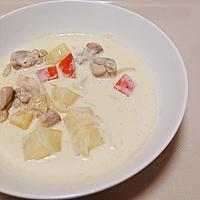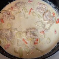 - 7 残りのクリームソースの材料を入れ、中火で沸騰直前になったら、弱火にして、鶏もも肉に火が通るまで5分程、時々かき混ぜながら煮込みます。