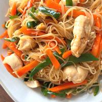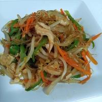 - 4 ささみに火が通ったら、春雨と、他の具材を全て加えて、水分が飛ぶまで炒めたら完成です。