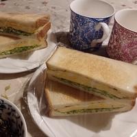 - 5 食パンにマスタードを塗り、1、4をのせて挟みます。ラップに包み、10分程休ませます。