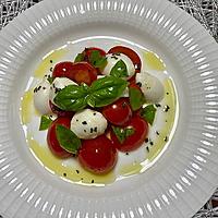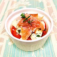 ミニトマト、モッツァレラチーズをシンプルにオリーブオイルと塩で和えました。最後に散らしたバジルが味のアクセントとなっております。見た目もかわいらしく、おもてなし料理としてもぴったりです。冷蔵庫で冷たく冷やしてお召し上がり下さい。