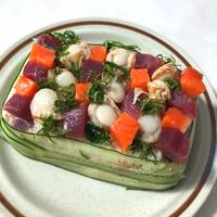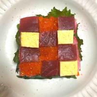 - 8 お皿に盛り、2cm角に切り取った4、5、イクラをのせて完成です。お好みでしょうゆとわさびをつけてお召し上がりください。