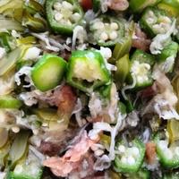 オクラは冷凍、梅干し多め、さっぱりして、茎わかめもコリコリ🎶🎶