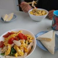 - 1 弱火に熱したフライパンにサラダ油をひき、溶き卵を流し入れ薄焼き卵を作ります。粗熱が取れたら3等分に切り千切りにします。