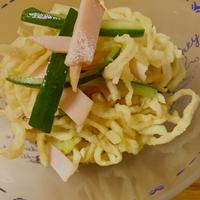 - 4 ハムは半分に切り、1cm幅の短冊切りにします。