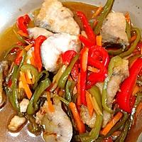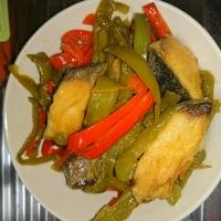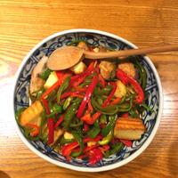 - 6 油を加えたフライパンで焼き、ピーマンとパプリカの甘酢漬けと合わせます。