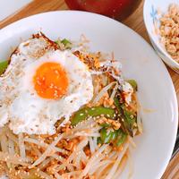 - 1 中火で熱したフライパンにごま油をひき、ピーマンをさっと炒め、もやしを入れてしんなりとするまで炒めます。