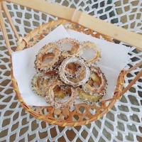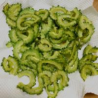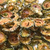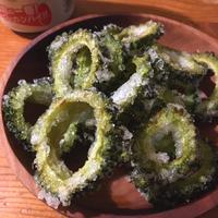 ゴーヤを薄切りにして片栗粉をまぶし、低温でじっくり、カリッと揚げました。ゴーヤの風味はしっかりあるのに、独特の苦味は和らいで食べやすいですよ。お酒のおつまみにぴったりですので、ぜひ作ってみてくださいね。