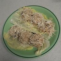 - 5 耐熱皿にレタスを敷き、4を並べてラップをし、600Wの電子レンジで6分程加熱し、中まで火が通ったら取り出します。