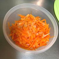 - 1 にんじんは細切りにします。ボウルに入れて塩と和え、しんなりとするまで10分程置きます。