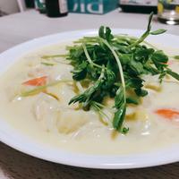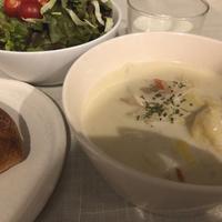 鶏肉なし、豆乳と牛乳を半々で。コーンを入れたのであまくなってしまいましたが、野菜消費出来て良かったです。