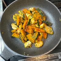 表面をカリっと焼いた、甘くてホクホクとしたかぼちゃと、鶏ささみ肉を炒め合わせ、粉チーズで香ばしく焼き上げました。電子レンジを使ってかぼちゃをやわらかくしておきますので、調理時間もグッと短縮されますよ。