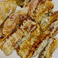 - 5 餃子の皮に大葉、4、2を乗せたら皮に水を付け餃子の口を閉じます。