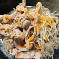 - 6 豚バラ肉に火が通ったら、お湯、(A)を入れて中火で熱し、ひと煮立ちさせたら火から下ろします。