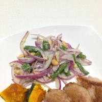 大豆とさやいんげんのサラダの紹介です。アクセントに玉ねぎスライスとパセリを加えました。豆類や野菜は冷蔵庫の残り物でアレンジしてください。あと一品という時におすすめです。ぜひお試しくださいね。