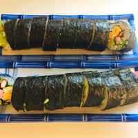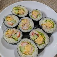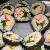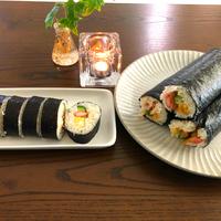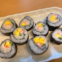 初巻き寿司にチャレンジ。巻きが少し弱かったけど美味しく出来ました☆