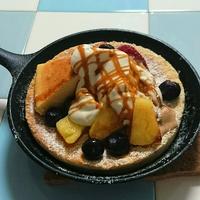 スキレットで焼いた、スフレオープンパンケーキのレシピのご紹介です。スキレットで焼き、そのまま提供するので、カフェの様な雰囲気でお召し上がり頂けます。卵白を別でメレンゲにしてから混ぜることで、ふわふわな食感になります。是非お試しください。
