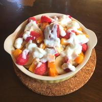 トッピングはすべて冷蔵庫&冷凍庫の物で間に合わせました。手作りのベイクドチーズケーキ・チョコレート味の棒アイス・七分立て生クリーム・冷凍フルーツ(いちご・ブルーベリー・パイン)。