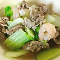 - 2 大きめの耐熱ボウルに1、豚肩ロース、エビ、水、(A)を入れ混ぜ合わせます。