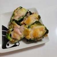 種ごとピーマンのチーズ焼きのご紹介です。ピーマンの種とワタは食べることができます。今回は種とワタもそのまま使用してチーズ焼きにしました。ベーコンの風味とこんがりと焼けたピザ用チーズが香ばしくおいしいですよ。