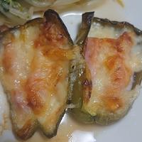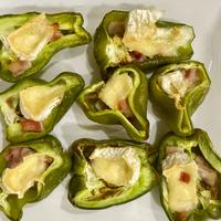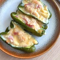 カマンベールチーズで代用。ピーマン4個に対しカマンベール40g。小さめのピーマンだったので、トースター200度7-8分で十分火が通りました。