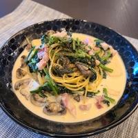 初めて、味噌味のパスタに挑戦。ほうれん草もマッシュルームも好きな食材。ほのかな和風クリーム味で美味しくいただけました。