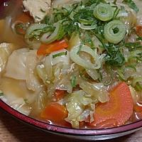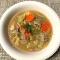 - 5 鍋に水と2、3を入れて強火で沸騰させたら、1、4を入れて中火で加熱します。アクを取り除き、豚こま切れ肉に火が通り、キャベツがしんなりするまで加熱したら(A)を入れて味を調えます。