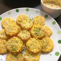 カリッとおいしい、おつまみにぴったりのズッキーニのチーズ焼きです。衣をまぶして、オーブンで焼くだけなのでとても簡単です。ゆず胡椒のピリッとしたソースがさらにおいしさを引き立ててくれます。お酒のおつまみに、ぜひ作ってみてくださいね。