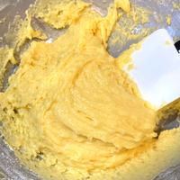- 3 グラニュー糖、バニラエッセンスを加えて混ぜます。ホットケーキミックスをふるい入れ、ゴムベラで混ぜ合わせます。