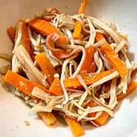 柚子胡椒のピリッとした刺激と爽やかな香りが特徴的な一品です。にんじんとえのきの食感の組み合わせが絶妙で、ポン酢のさっぱりとした味わいが食欲をそそります。オリーブオイルは控えめにすることがポイントで、ごま油に変えても風味良く仕上がります。カニカマを加えると旨味がアップし、すりごまをトッピングしても美味しく、電子レンジで手軽に作れるのも魅力です。