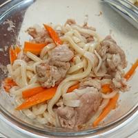 - 3 別の耐熱ボウルにうどんを入れラップをしパッケージの表記通りに電子レンジで加熱し、解凍します。