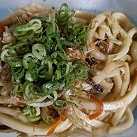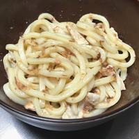 レンチンしたうどんは、ひと袋ずつボールのお汁に浸してほぐしてからお皿に。後で具を上からのせる。