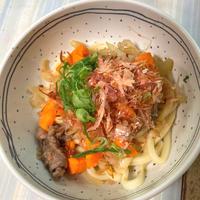 フライパンを使わず簡単にできる焼きうどんはいかがでしょうか。具材も冷凍うどんも電子レンジで加熱するだけで簡単にできますよ。今回は豚こま切れ肉を使いましたが、豚バラ肉や牛こま切れ肉などお好みの具材でアレンジもできるので是非お試しください。