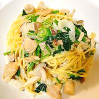 牛乳だけで手軽に作れるクリームパスタは、きのこの旨味がたっぷり溶け出してコクのある味わいに。鶏もも肉としめじ、しいたけの組み合わせが絶妙です。仕上げに粉チーズや黒こしょうをかけると、より本格的な味わいに。さらにほうれん草や玉ねぎを加えてアレンジするのも人気です。とろみを出したい場合は小麦粉を加えると、ソースがパスタによく絡んでさらに美味しく仕上がります。
