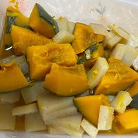- 1 かぼちゃは、一口大に切ります。