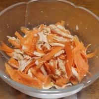 サラダチキンを使用し、さらに時短!さっぱり味がおいしかったです。ただ、生の人参独特のえぐみ?があるので次回はレンチンしてみます。