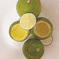 - 2 かぼすを上から1cmのところで切ります。中身をくり抜き、果肉をザルで漉して果汁を大さじ2分取っておきます。