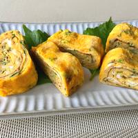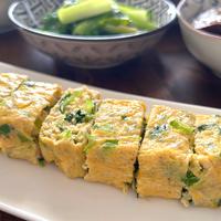 小松菜とちりめんじゃこを加えて卵焼きを作りました。緑色がきれいな断面が華やかな一品です。お好みでピザ用チーズを混ぜてもとっても美味しいですよ。ぜひお試しくださいね。